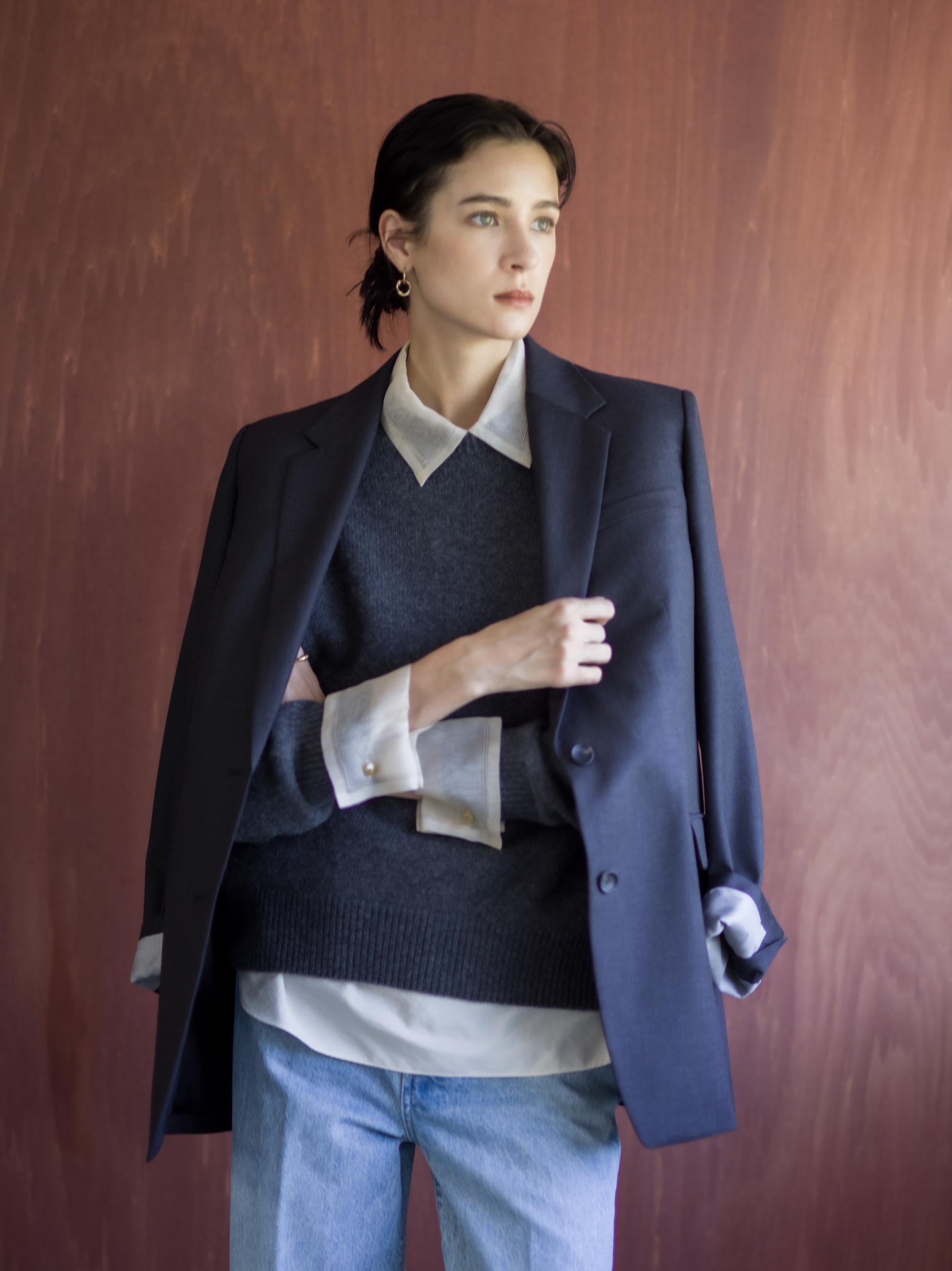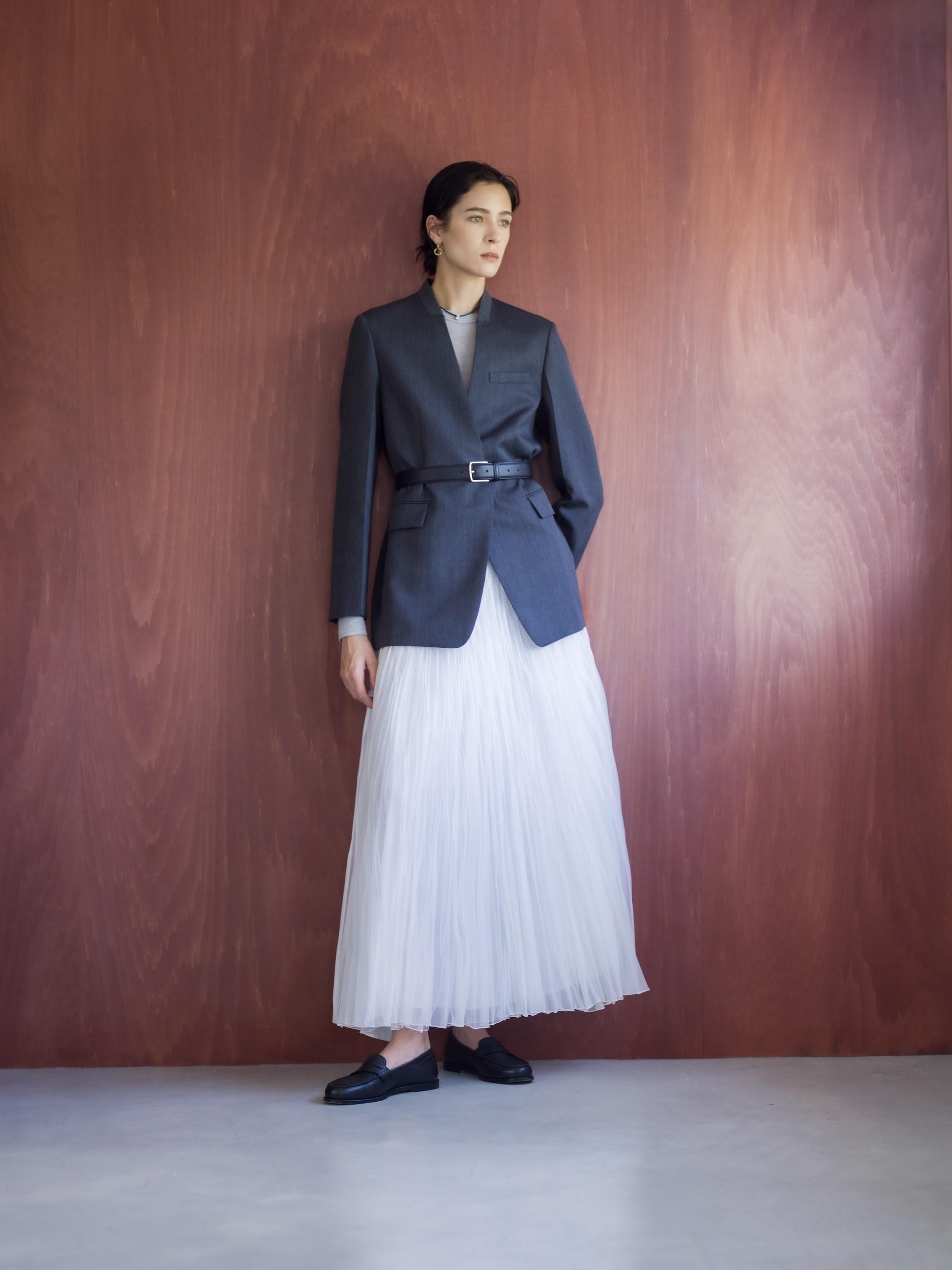 メンズライクな仕立ての中に、ウエストをさりげなくシェイプすることで女性らしい柔らかさを添えました。